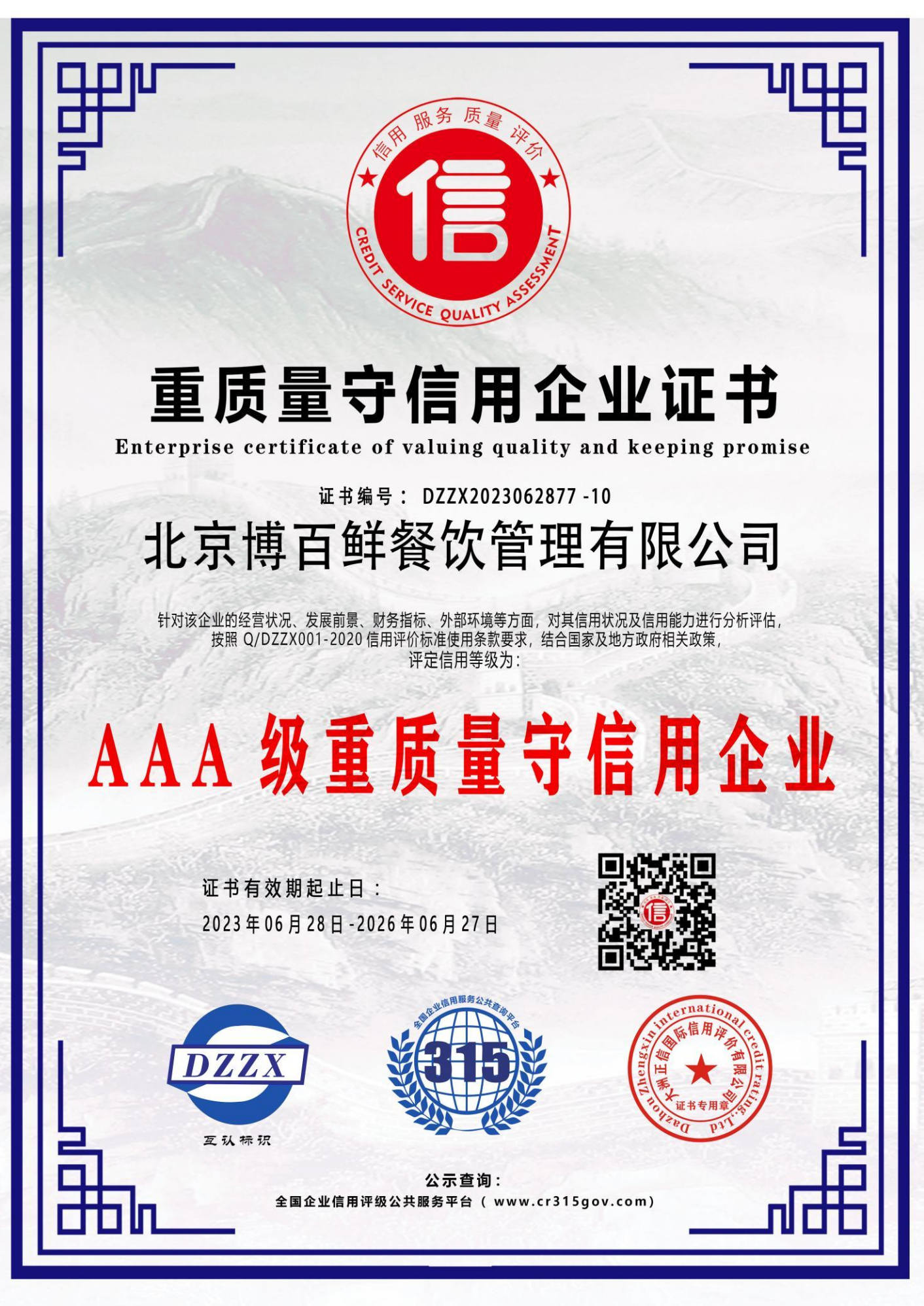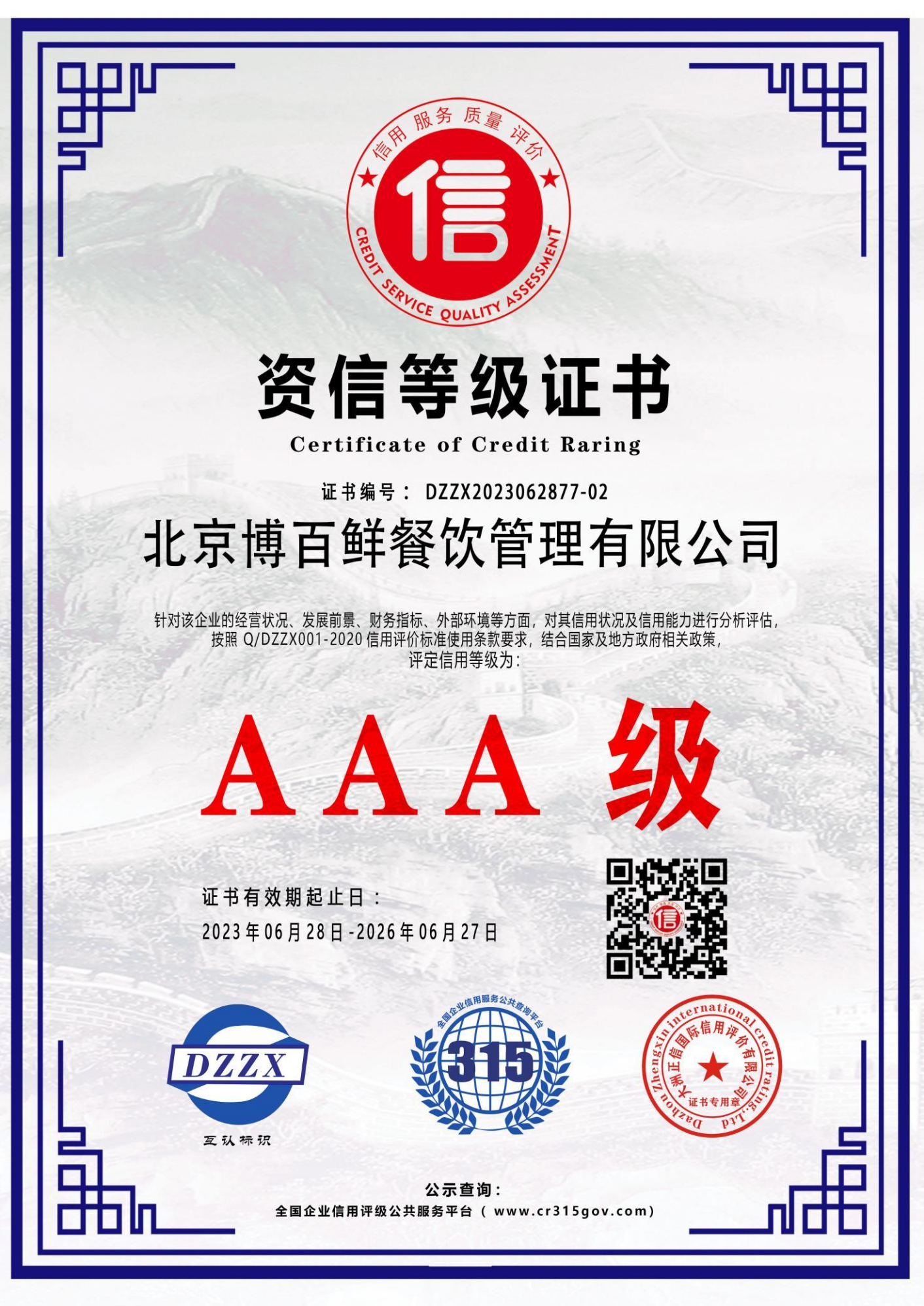 AAA级资信等级证书