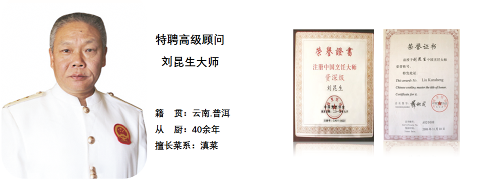 特聘请当代烹饪泰斗、屡获殊荣的刘昆生大师为公司高级顾问,